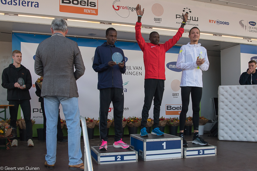 De Oegandees Rogers Kibet won de 34e editie van de 4 Mijl van Groningen in een tijd van 17.27. Het parcoursrecord van 17.06 kwam niet in gevaar. Tweede werd de Keniaan Jamal Kiprono in 17.33.
